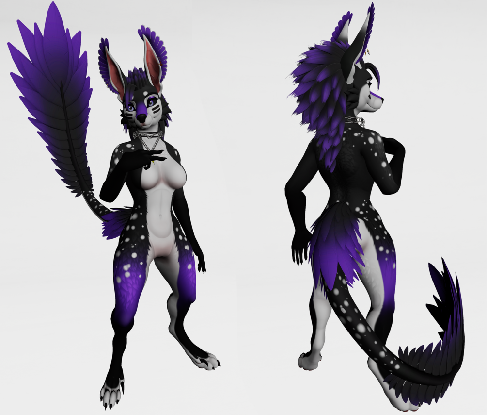 You will only Receive texture for the Body, Eyes, all tails and hair + Mask for all Spots and White tip of the ears Feather! So you can have some AudioLink or play with matcap. Be creative! Come with Male and Female Body shading!
